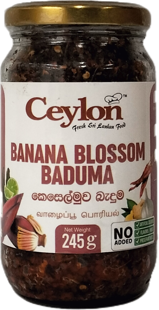 INGREDIENTS: Banana Blossom, Onion, Crushed Chilli, Maldive Fish, Lime, Vegetable cooking oil, Sugar, Garlic, Ginger, Salt, Pandan Leaves